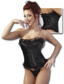 Korzet+kalhotky z černého lesklého materiálu, okraje zdobené nařasenou krajkou. Vpředu zapínání na háčky, vzadu šněrování. Kalhotky string v hladkém provedení.- Běžná cena s DPH: 1 119,00 Kč