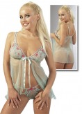 Romantická a sexy souprava - transparentní košilka vepředu na zavazování s úzkými ramínky s nastavitelnou velikostí, zajímavě řešené kalhotky - na bocích s dvojitým proužkem. Košilka je zdobena drobnými kytičkami.